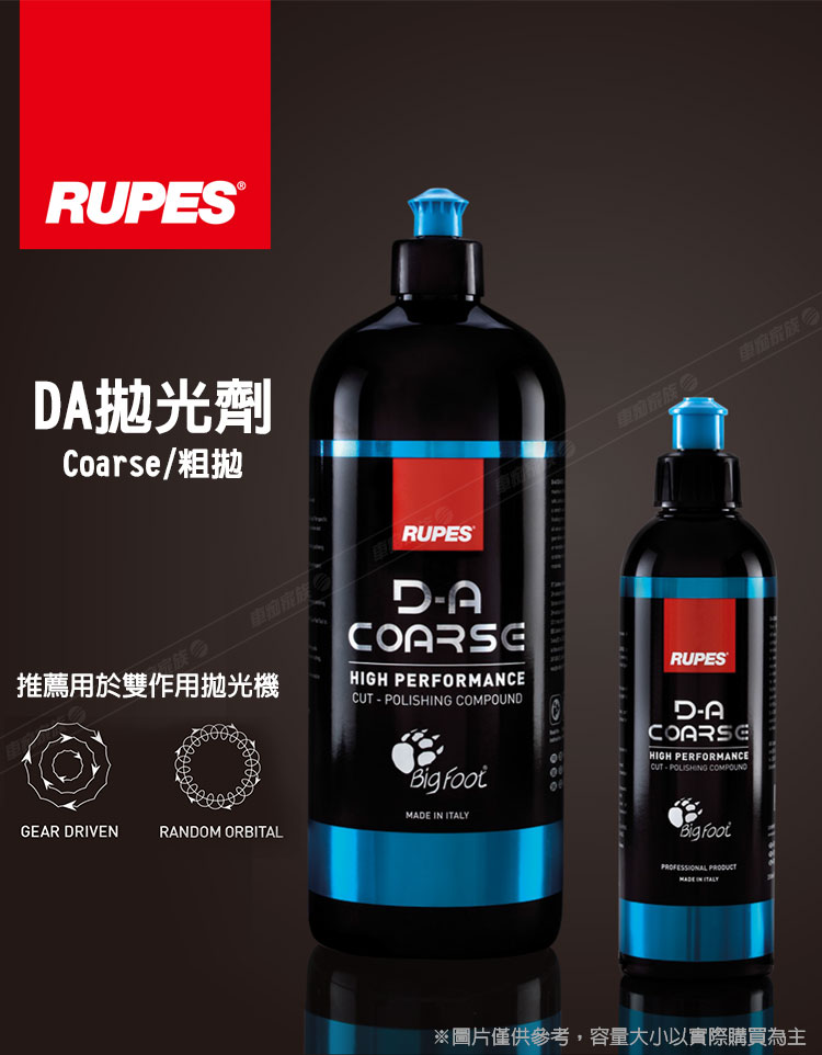 ◎高性能切削化合物 ◎低粉塵配方減少施工後的清理工作 ◎獲得流暢且快速去除缺陷 ◎中度至重度缺陷去除和精加工 ◎打磨標記和嚴重缺陷去除 品名:【義大利RUPES大腳】DA拋光劑 Coarse/粗拋 型號: 容量:250ml 主要成分: 產地:義大利 包裝異動或商品圖檔顏色可能因電腦螢幕設定差異略有不同,請依收到之實品為準。 辦理商品退換貨時,如有贈品或配件,麻煩請一併寄回,否則視同缺件無法受理!