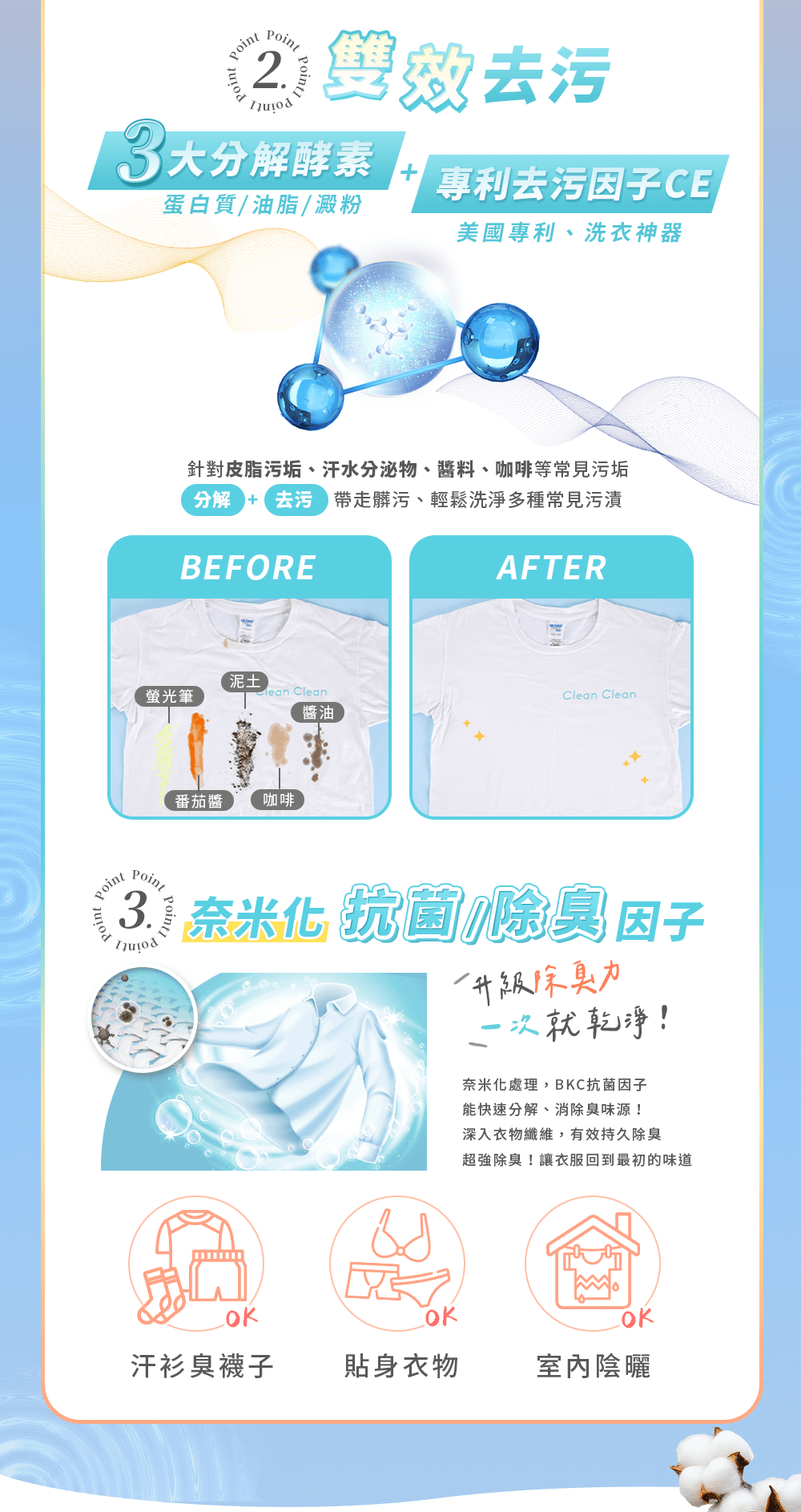 - 專利去污因子+酵素常見污垢輕鬆洗。