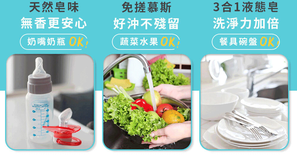 ◆ 淨淨奶瓶蔬果清潔劑採用 3 合 1 植物液態皂配方、不含香料、防腐劑,有效清除奶垢、洗淨蔬果殘留農藥,好沖不殘留、溫和不咬手,媽媽洗奶瓶的最佳選擇!
