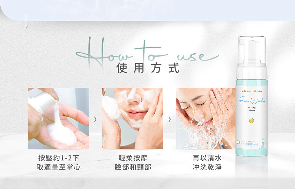 用法:早晚壓取適量慕斯泡沫於手心輕搓,均勻打圈於略濕的全臉,輕柔按摩後,用清水沖洗乾淨。
