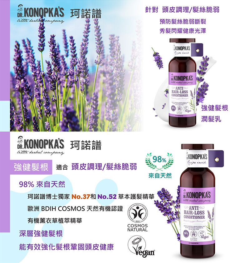 .多種植物油和萃取精華:含有Dr. Konopka’s特製的N37和N52有機草本護髮油、椰子油、橄欖果油、茶樹葉油、摩洛哥堅果油、玫瑰果油和霍霍巴籽油等多種天然植物萃取精華。這些油脂富含健康頭髮所需的維生素和抗氧化劑,能有效保濕、修復和抗氧化,防止髮絲脆弱斷裂,使頭髮更加強韌、滋潤,並呈現出自然的光澤和彈性。