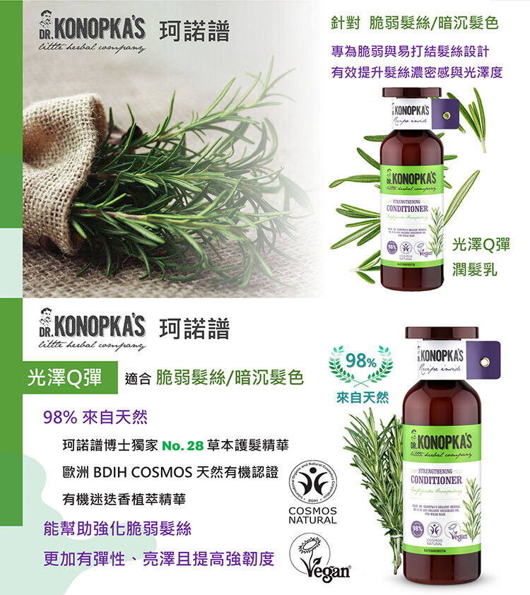 .多種植物油和萃取精華:含有Dr. Konopka’s特製的N28有機草本護髮油和有機迷迭香油,能有效對修補脆弱的髮絲和防止打結,幫助頭髮變得更厚實和光澤。