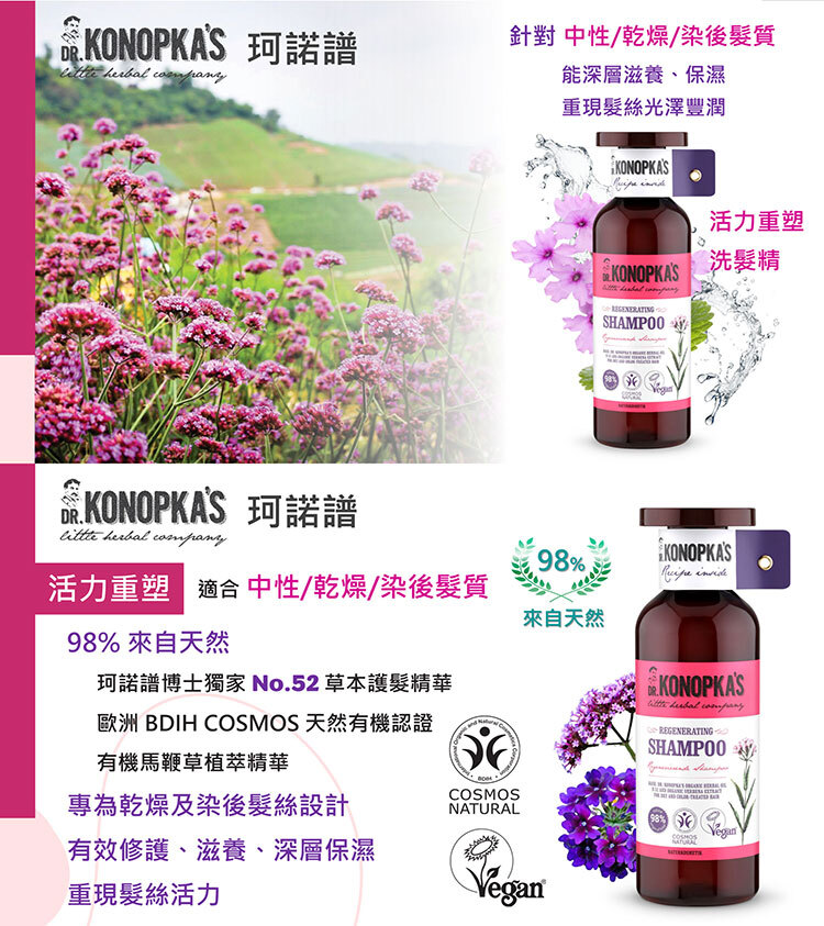 ◆這款活力重塑洗髮精含有珂諾譜博士獨家秘方 No. 52 特製草本護髮油(通過 BDIH COSMOS 有機認證),