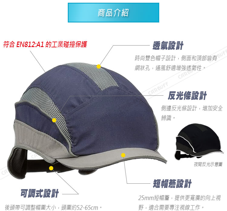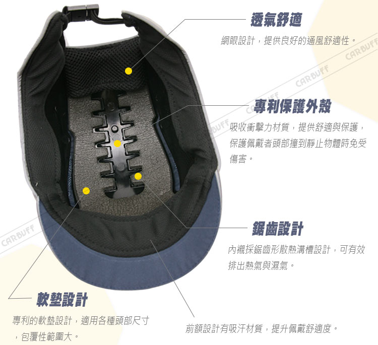 ◎防撞隔層及布質帽帶皆有網狀穿孔,通風舒適