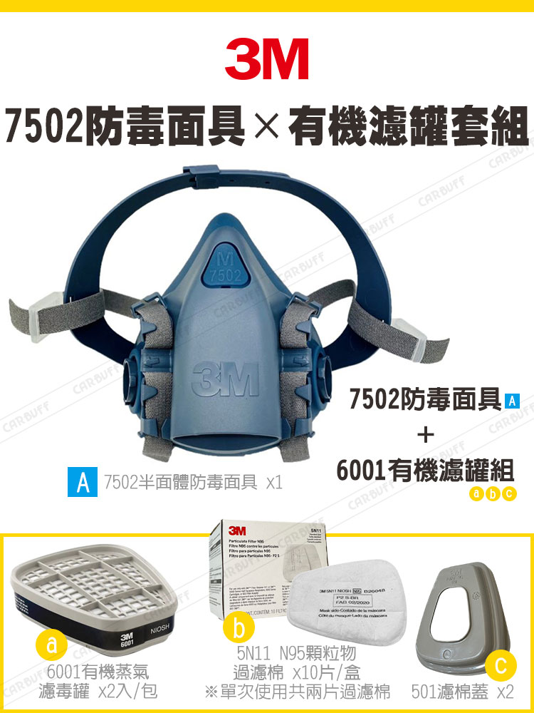 3M 7502防毒面具X有機濾罐套組(6001有機氣體濾毒罐+5N11過濾棉+濾蓋)